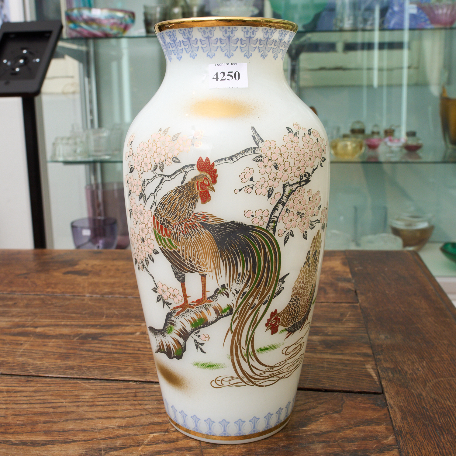 A GLASS VASE WITH ROOSTER DECORATION H.31CM, LEONARD JOEL LOCAL DELIVERY SIZE: SMALL