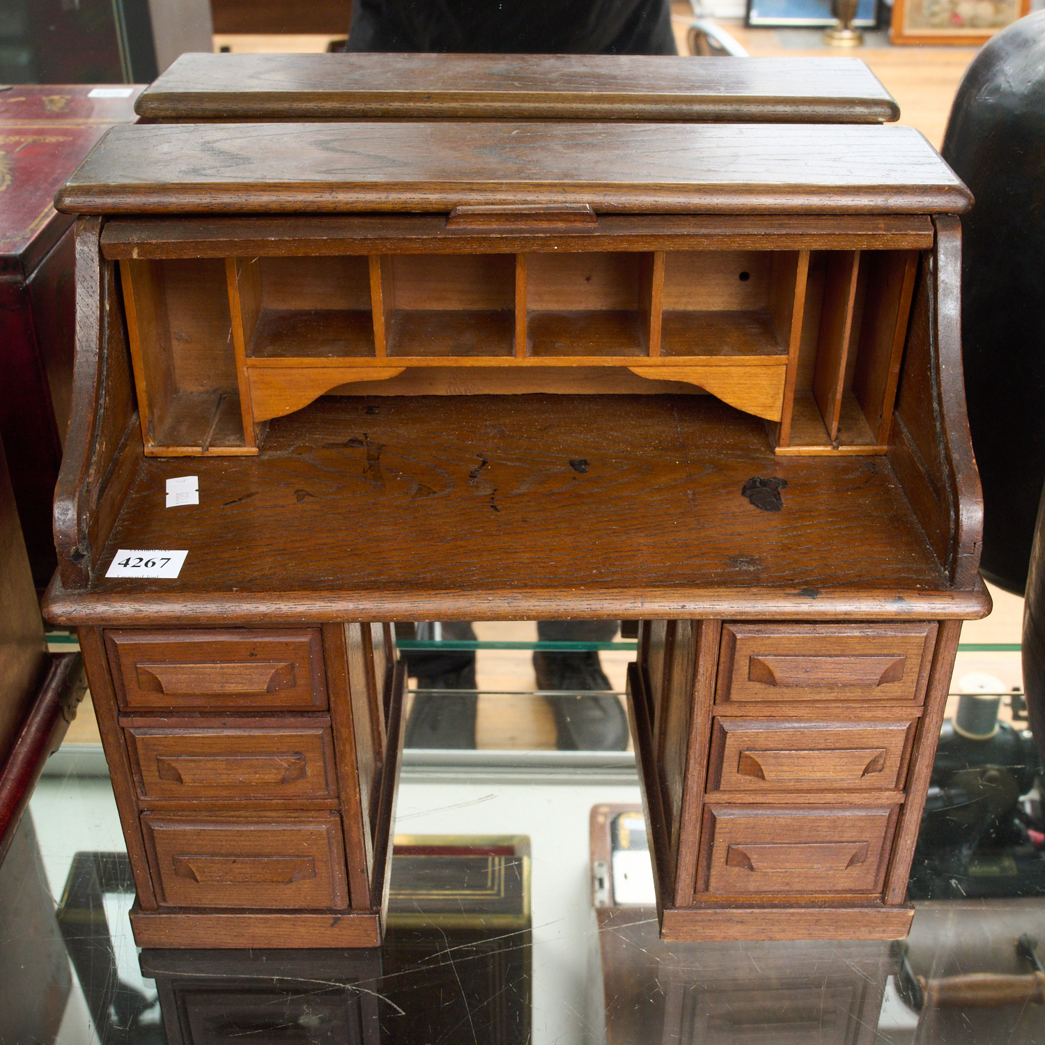 A 19TH CENTURY SALESMANS SAMPLE SIX DRAWER ENGLISH OAK ROLL TOP DESK, H 28CM, LEONARD JOEL LOCAL DELIVERY SIZE: SMALL