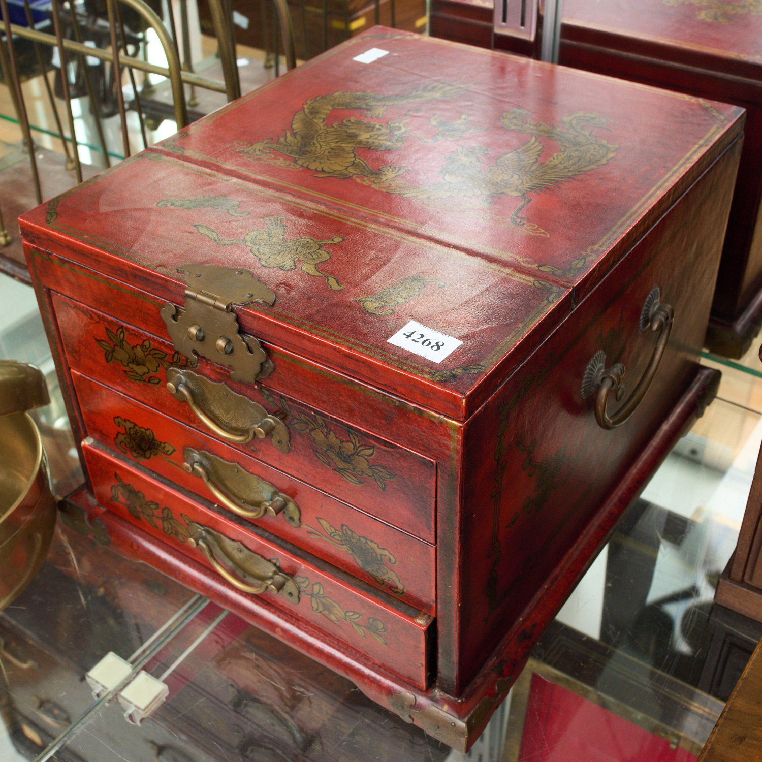 A HAND PAINTED WOODEN THREE DRAWER MIRROR TOPPED VANITY BOX WITH BRASS HANDLES, W. 25 X L. 30, H. 20.5CM, LEONARD JOEL LOCAL DELIVERY SIZE: SMALL