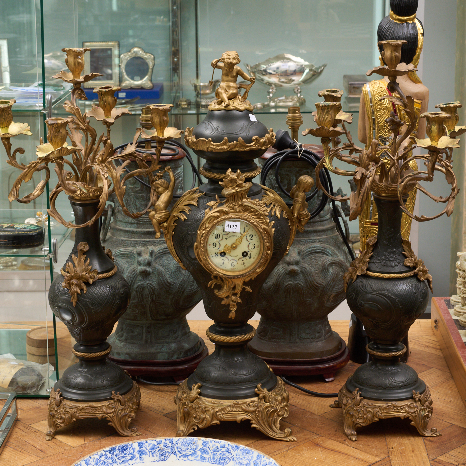 A 19TH CENTURY FRENCH THREE PIECE GILT BRONZE AND PATINATED BRASS CHERUB ADORNED CLOCK GARNITURE BY H LUPPENS BRUXELLES, LEONARD JOEL LOCAL DELIVERY SIZE: MEDIUM