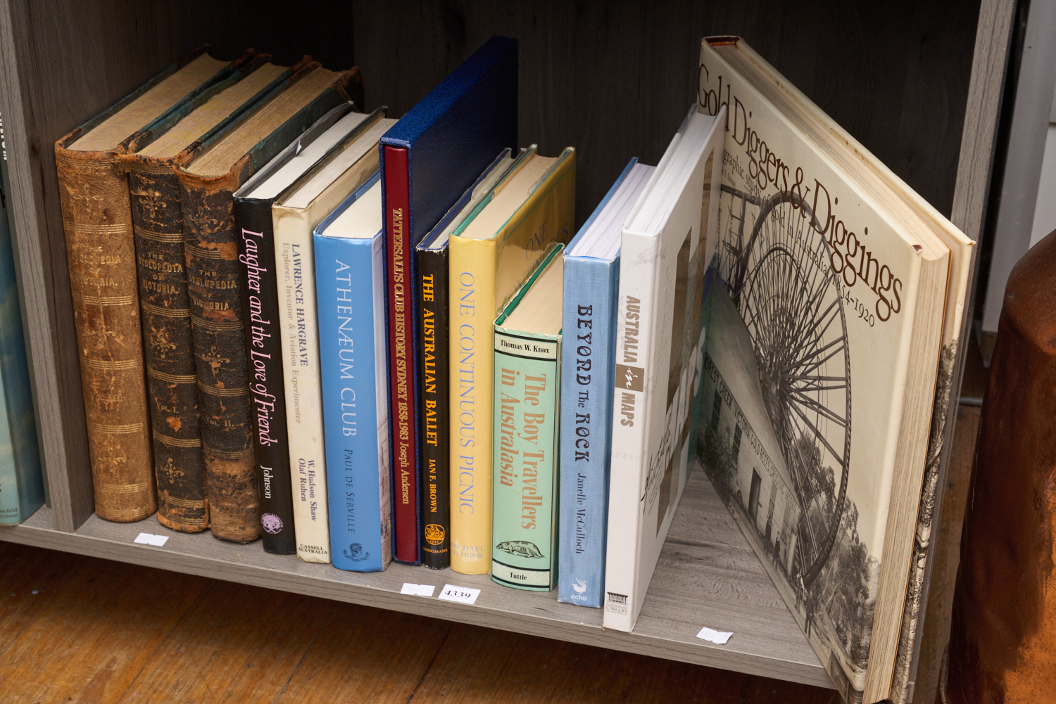 A SHELF OF AUSTRALIAN HISTORICAL REFERENCE INCLUDING 'THE CYCLOPEDIA OF VICTORIA' (THREE VOLUMES PUBLISHED 1904), DERRICK STONE (ED), 'GOLD DIGGERS & DIGGINGS', JOSEPH JOHNSON 'LAUGHTER & THE LOVE OF FRIENDS', LEONARD JOEL LOCAL DELIVERY SIZE: MEDIUM