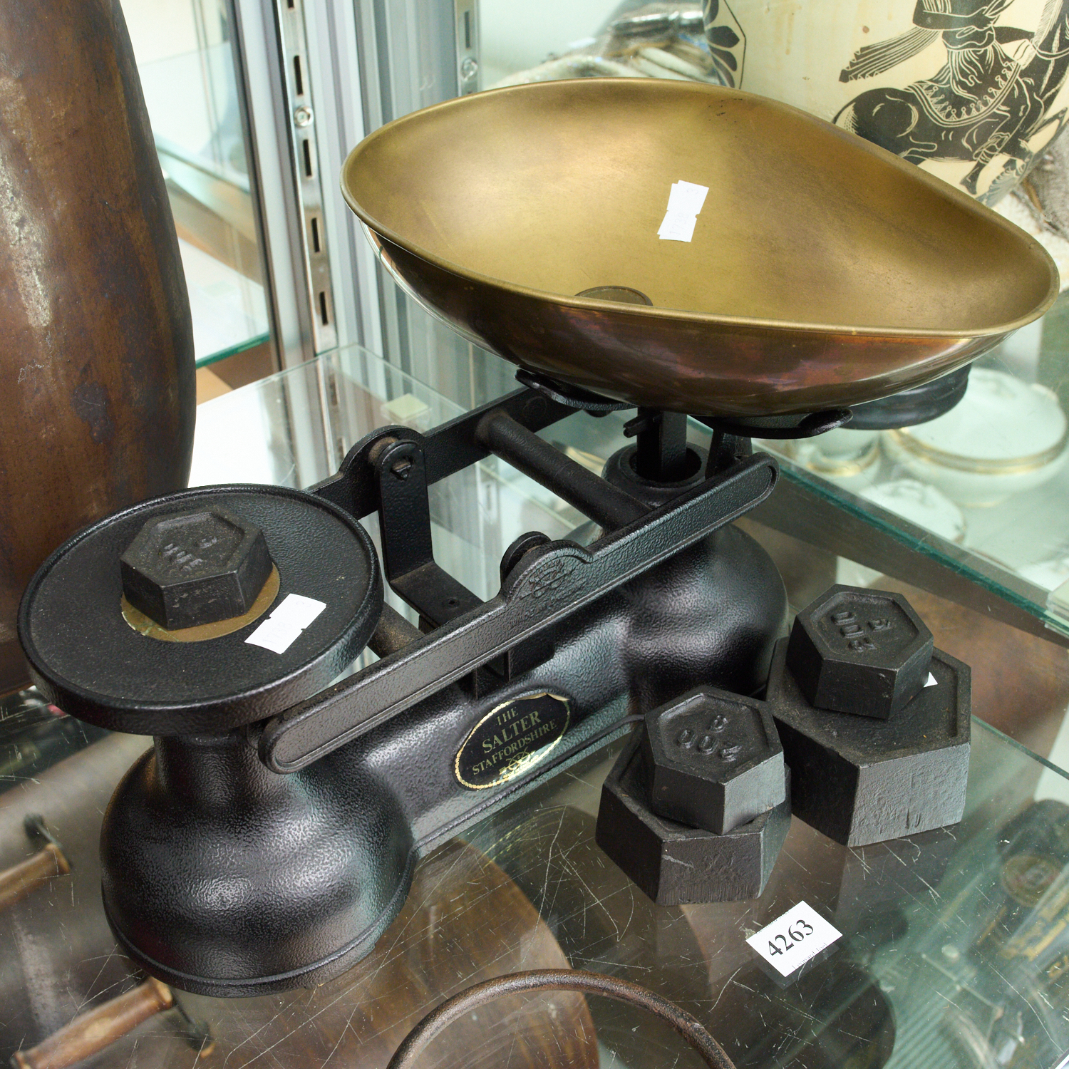 A SET OF SCALES 'THE SALTER STAFFORDSHIRE' WITH WEIGHTS W. 27, LEONARD JOEL LOCAL DELIVERY SIZE: SMALL