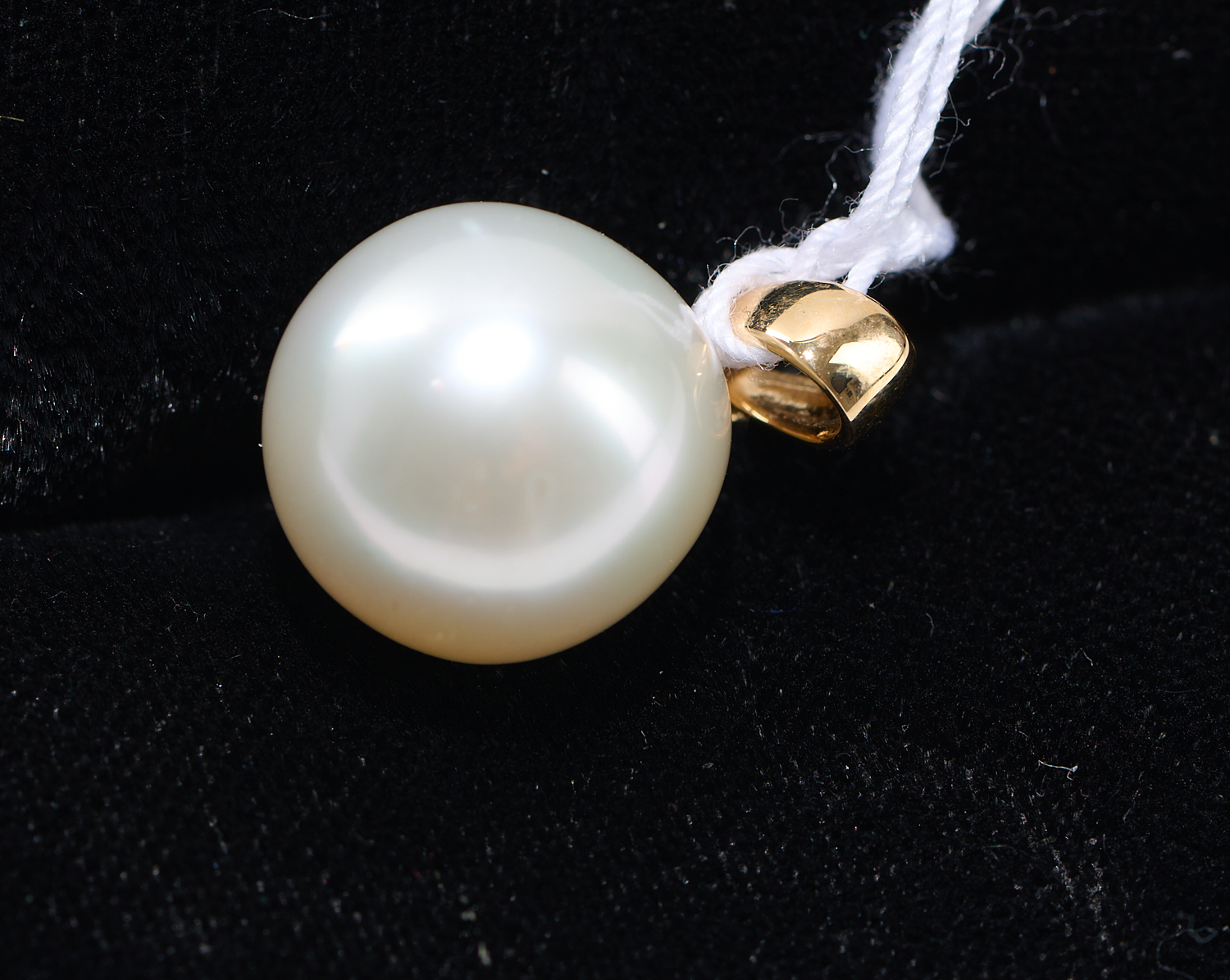 A 12MM SOUTH SEA PENDANT TO AN 18CT GOLD PENDANT
