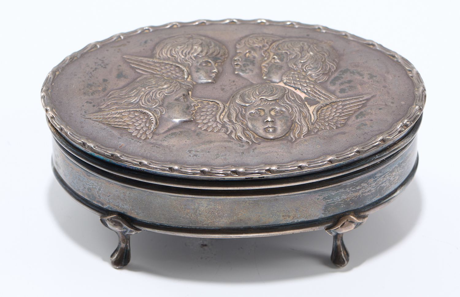 A SILVER TRINKET BOX WITH ANGEL DECORATION, BIRMINGHAM 1906-7