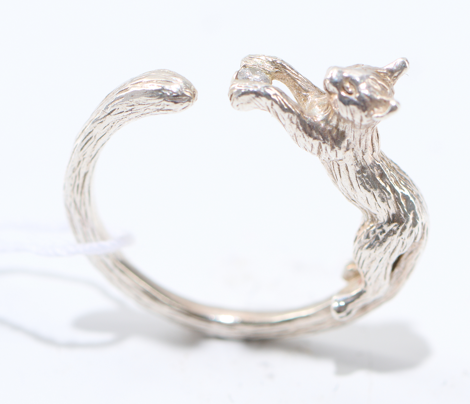 A DIAMOND SET RING IN A CAT DESIGN IN STERLING SILVER BY SIMMON, RING SIZE E