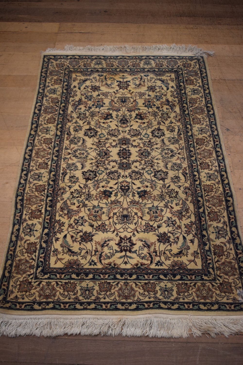 A HANDMADE 100% WOOL PERSIAN RUG IN CREAM AND BLUE TONES (A/F) (171 x 94 CM) (LEONARD JOEL DELIVERY SIZE: LARGE)