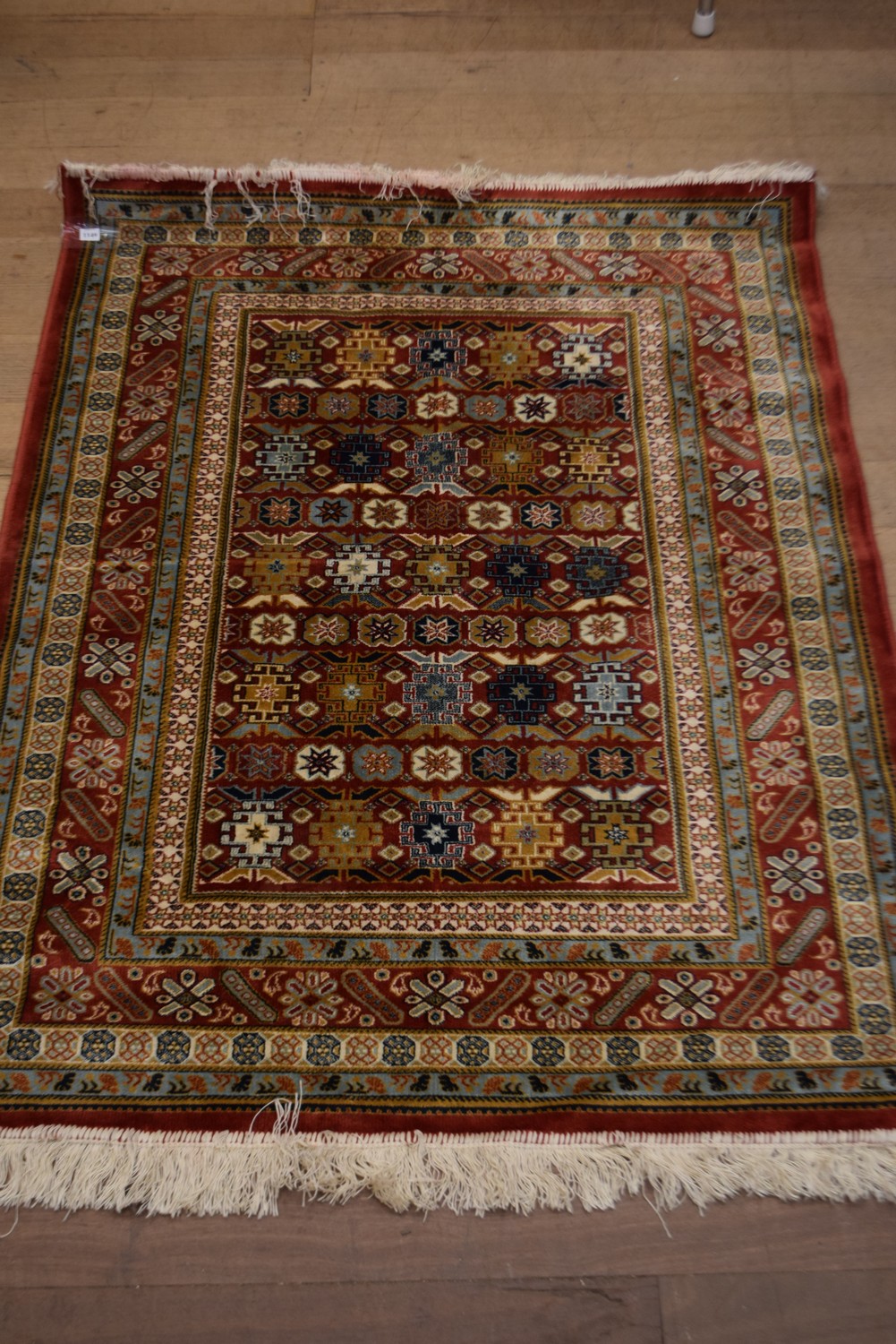 A SILK ON COTTON BASE PERSIAN RUG IN RED AND BLUE TONES (A/F) (135 x 99 CM() (LEONARD JOEL DELIVERY SIZE: MEDIUM)