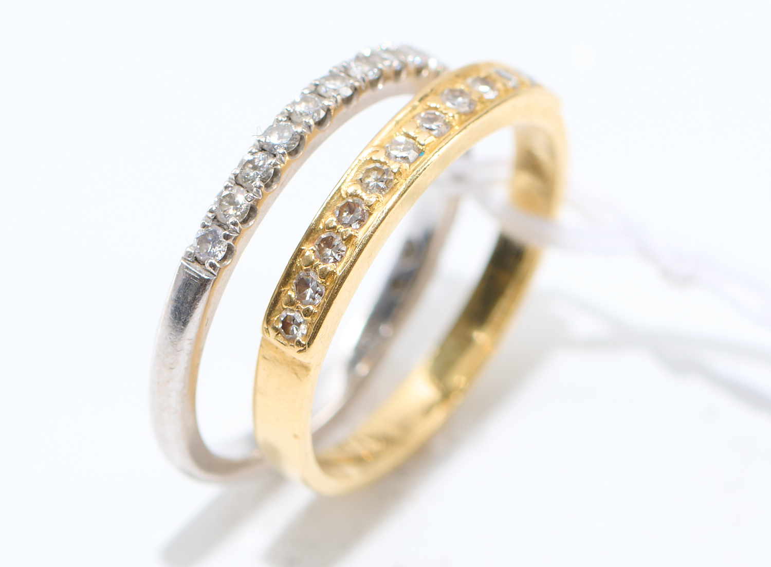 TWO DIAMOND BAND RINGS SET IN 18CT GOLD, ONE TOTALLING 0.28CTS (F VS) IN 18CT WHITE GOLD AND ONE SET WITH SINGLE CUT DIAMONDS, BY SIMON WEST, RING SIZE J, 3.94GMS
