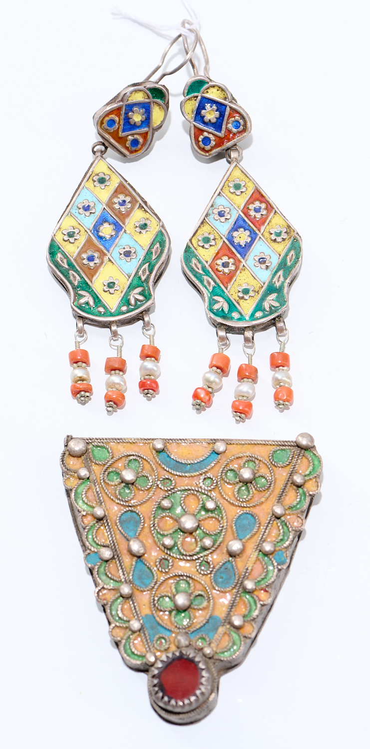 A PAIR OF VINTAGE TRIBAL EARRINGS AND PENDANT WITH ENAMEL AND FLORAL WORK, POSSIBLY UZBEKISTAN