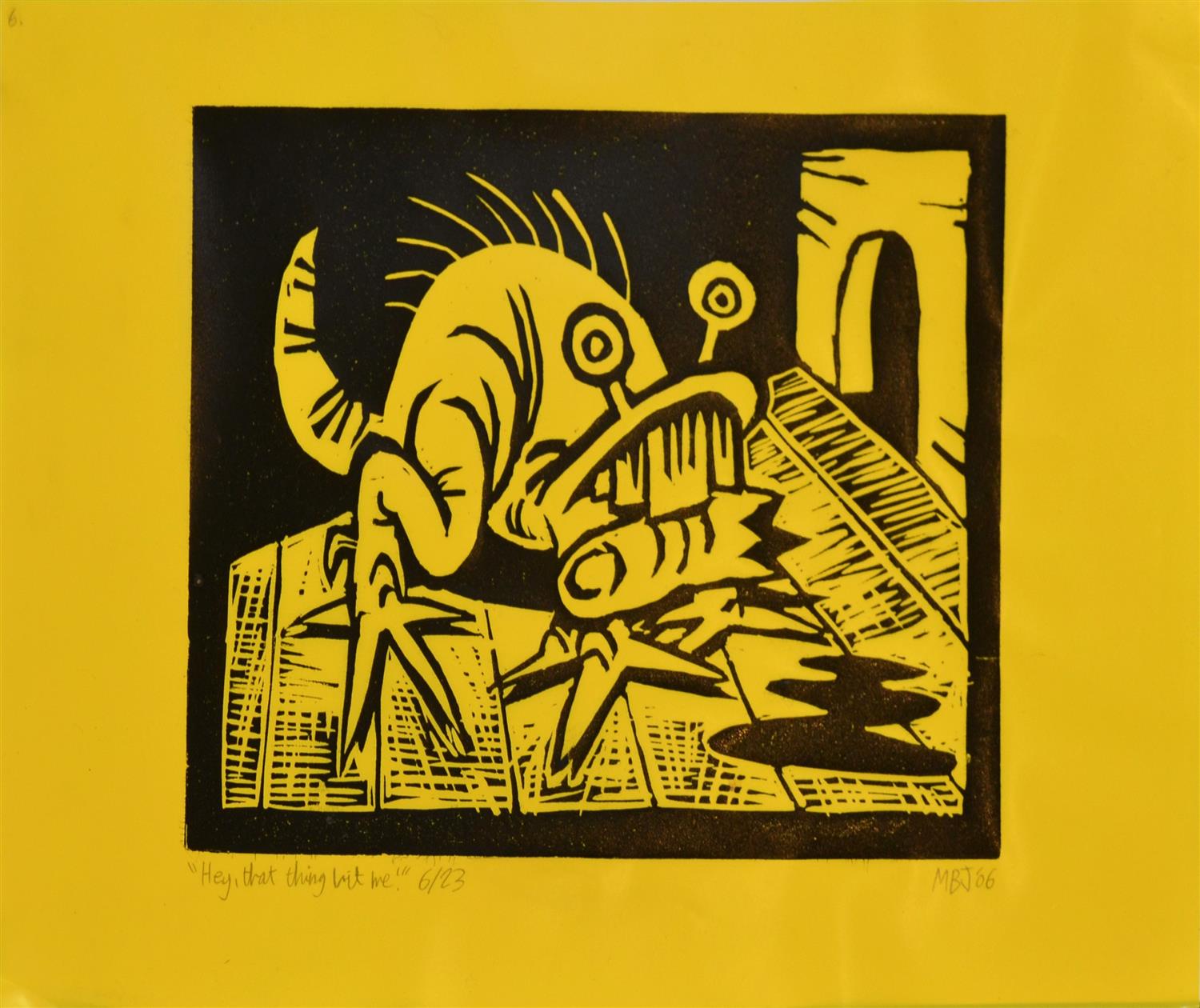 MATT BISSETT-JOHNSON, HEY, THAT THING BIT ME 2006, LINOCUT 6/23, 28 X 38CM