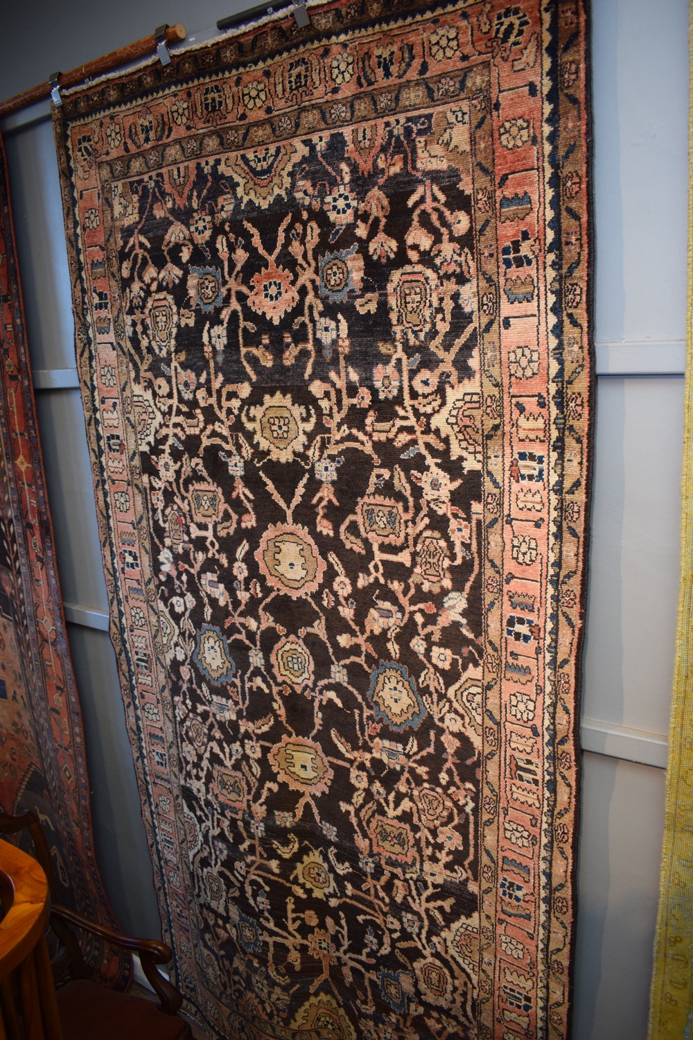 A MAGNIFICENT CIRCA 1960S PERSIAN NANAJ CARPET. 100% WOOL. NATURAL DYES, ABRASH COLOURS. HAND-KNOTTED VILLAGE WEAVE FROM THE MALAYER REGION WITH TRADITIONAL (ALL-OVER) DESIGN OF SYMMETRICAL STYLIZED FLORAL PATTERNS AND PALMETTES SET WITHIN A NAVY-BLUE BACKGROUND. MAJOR BORDER OF TRIBAL PALMETTES AND TENDRILS. MINOR BORDERS OF FLOWER HEADS. CERTIFICATE OF AUTHENTICITY INCLUDED. SIZE: 315X160CM ORIGIN: PERSIA - RRP: $4,400