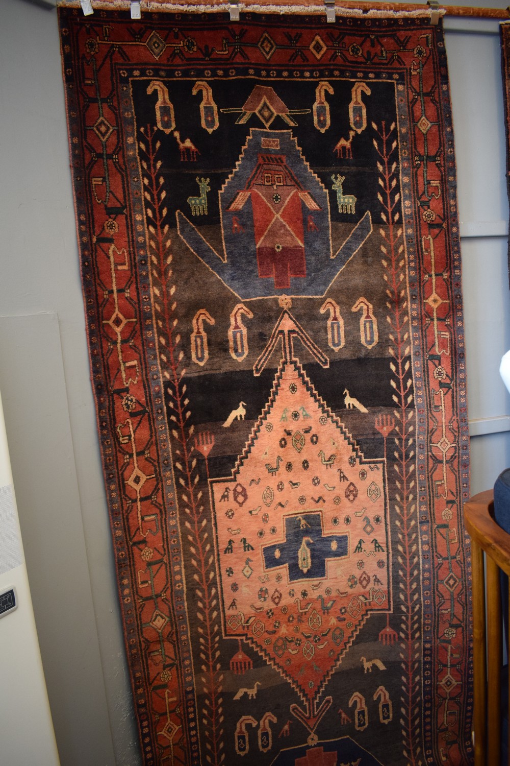 A UNIQUE PERSIAN TRIBAL BIDJAR GHOLTOGH RUG, 100% WOOL PILE, SOLID. IN GREAT CONDITION. HAND-KNOTTED TRIBAL WEAVE FROM THE KURDISTAN REGION AND TRIBAL DESIGN OF BOLD ANCHORED HEXAGONAL MEDALLION CONTAINING ANIMAL MOTIFS IN A CHARCOAL FIELD OF PAISLEY PATTERNS AND ANIMAL FORM. BORDER OF FLOWER HEADS. CERTIFICATE OF AUTHENTICITY INCLUDED. SIZE: 377X146CM ORIGIN: IRAN - RRP: $4,800
