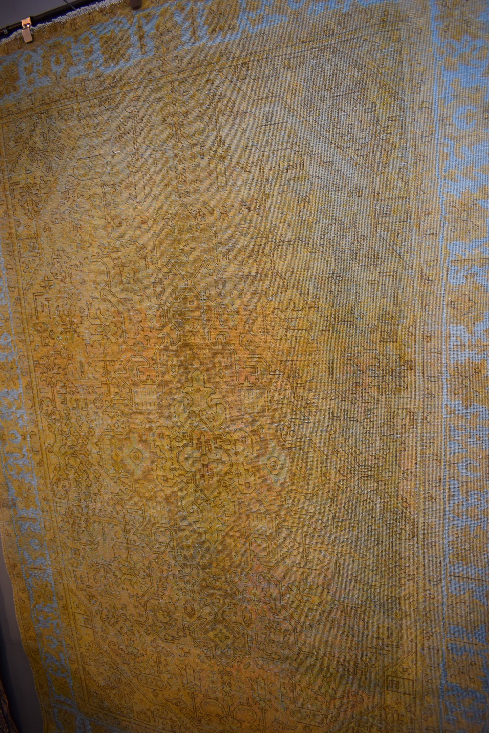 A VINTAGE OVER-DYED PERSIAN TABRIZ CARPET. CREATED FROM AN ORIGINAL TABRIZ DESIGN. VINTAGE SHORNPILE AND OVER-DYED IN AQUA, GREEN & GOLD TONES. HAND KNOTTED. AS SEEN IN INTERIOR DESIGN MAGAZINES. CERTIFICATE OF AUTHENTICITY INCLUDED. SIZE: 295X200CM ORIGIN: PERSIA - RRP: $4,900