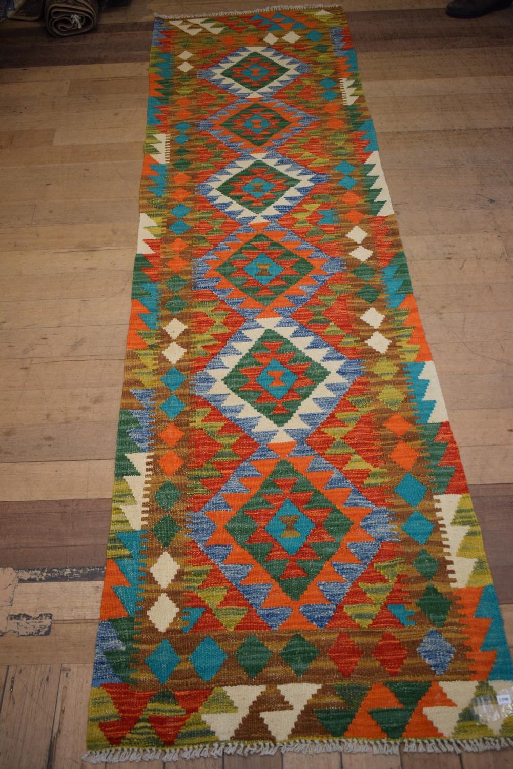 A 100% WOOLEN KAZAK RUNNER WITH NATURAL VEGETABLE DYES, HAND SPUN WOOL AND DIAMOND CUT DESIGN (281 x 78 CM) (LEONARD JOEL DELIVERY SIZE: LARGE)