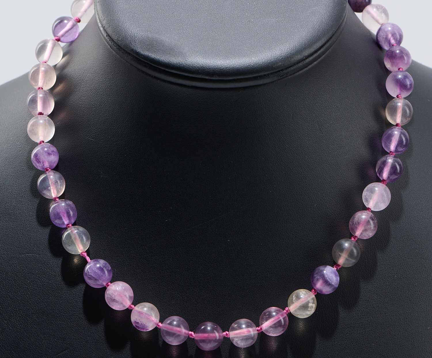A AMETHYST AND FLUORITE NECKLACE,  TO A SILVER MAGNETIC CLASP. LENGTH 450MM