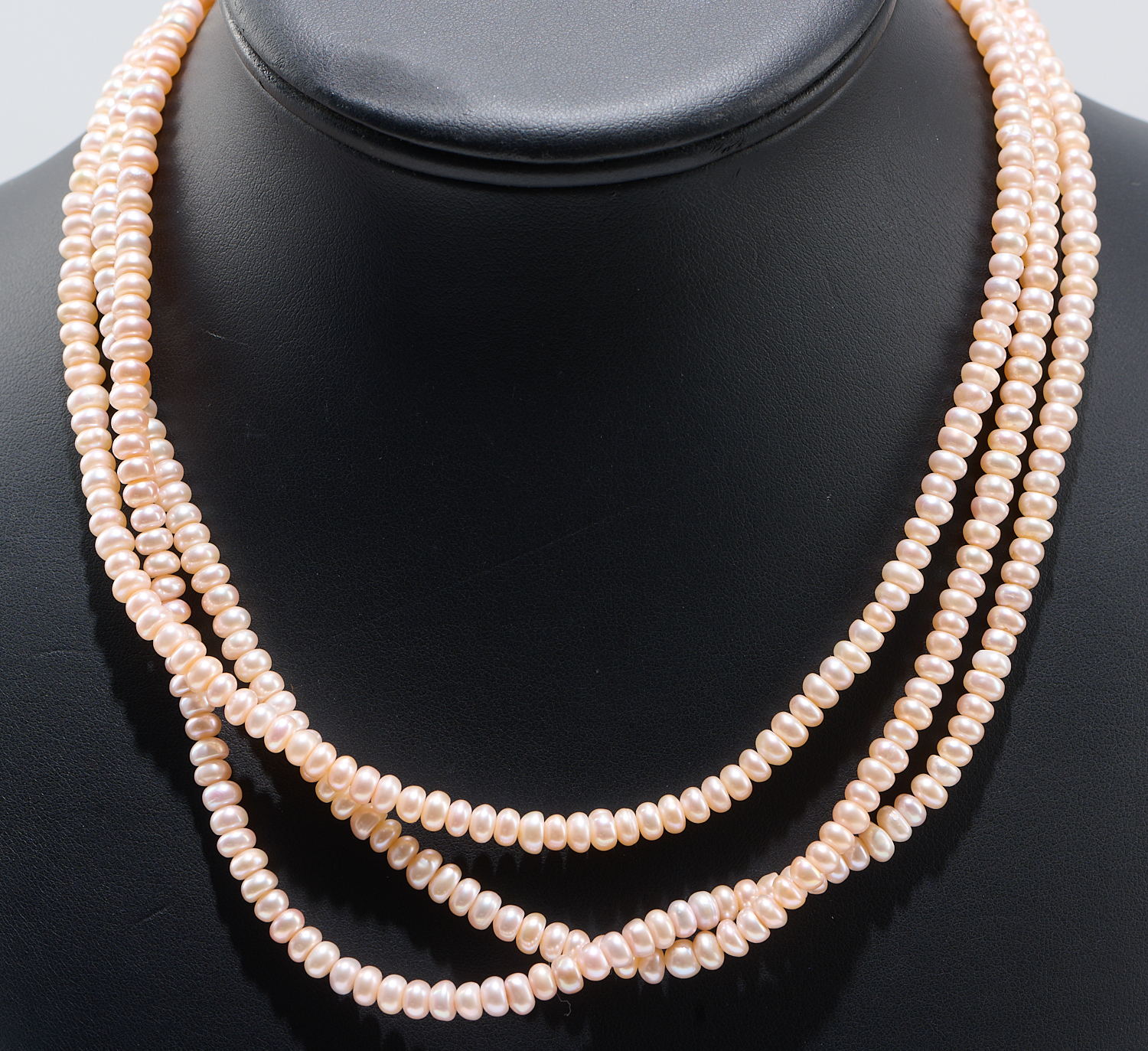 A TRIPLE STRAND FRESHWATER PEARL NECKLACE, LENGTH 420MM