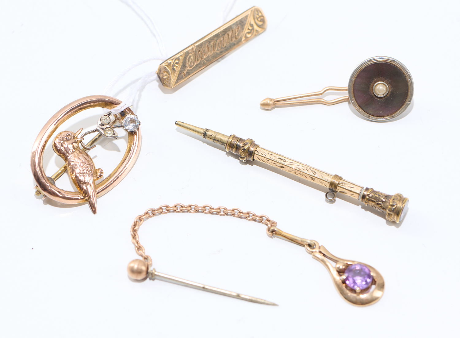 A COLLECTION OF GOLD FINDINGS, INCLUDING A BROOCH IN 9CT GOLD AND A PROPELLING PENCIL