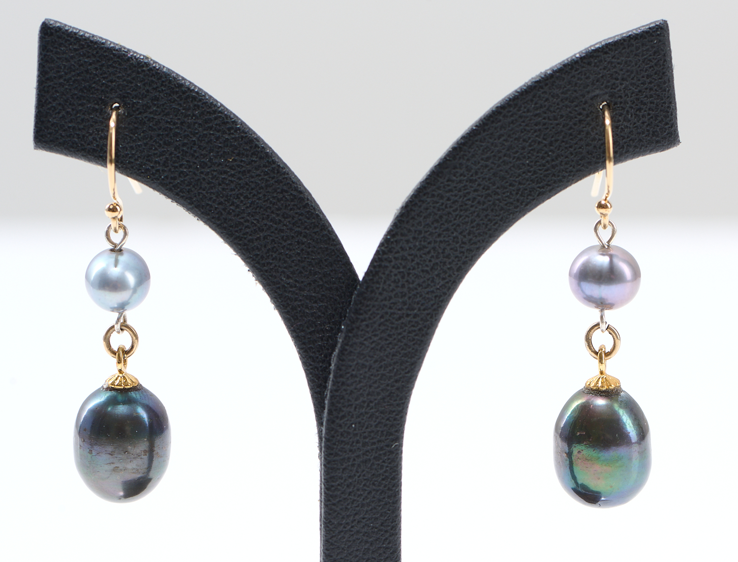 A PAIR OF TWO TONE GREY PEARL DROP EARRINGS, TO SHEPHERDS HOOK FITTINGS IN SILVER GILT