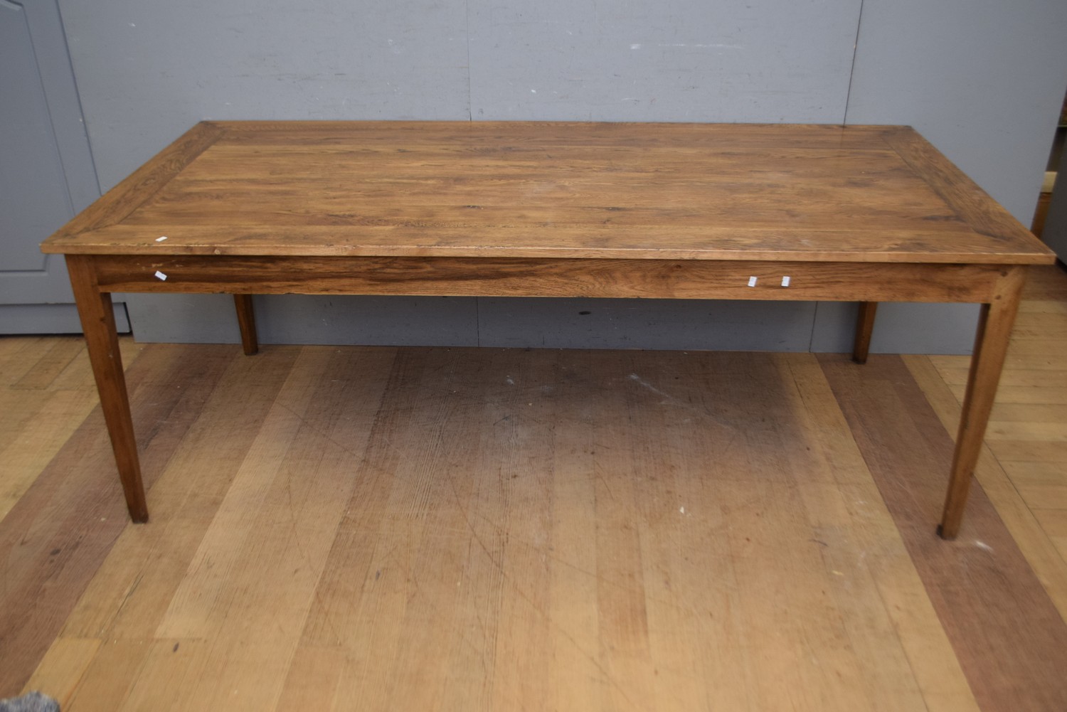 AN OAK FARMHOUSE STYLE DINING TABLE WITH TPAERED LEGS ( 77H X 210W X 103D CM) (PLEASE NOTE THIS HEAVY ITEM MUST BE REMOVED BY CARRIERS AT THE CUSTOMER'S EXPENSE. LEONARD JOEL STAFF CANNOT ASSIST CARRYING THIS ITEM) (X-LARGE ITEM)