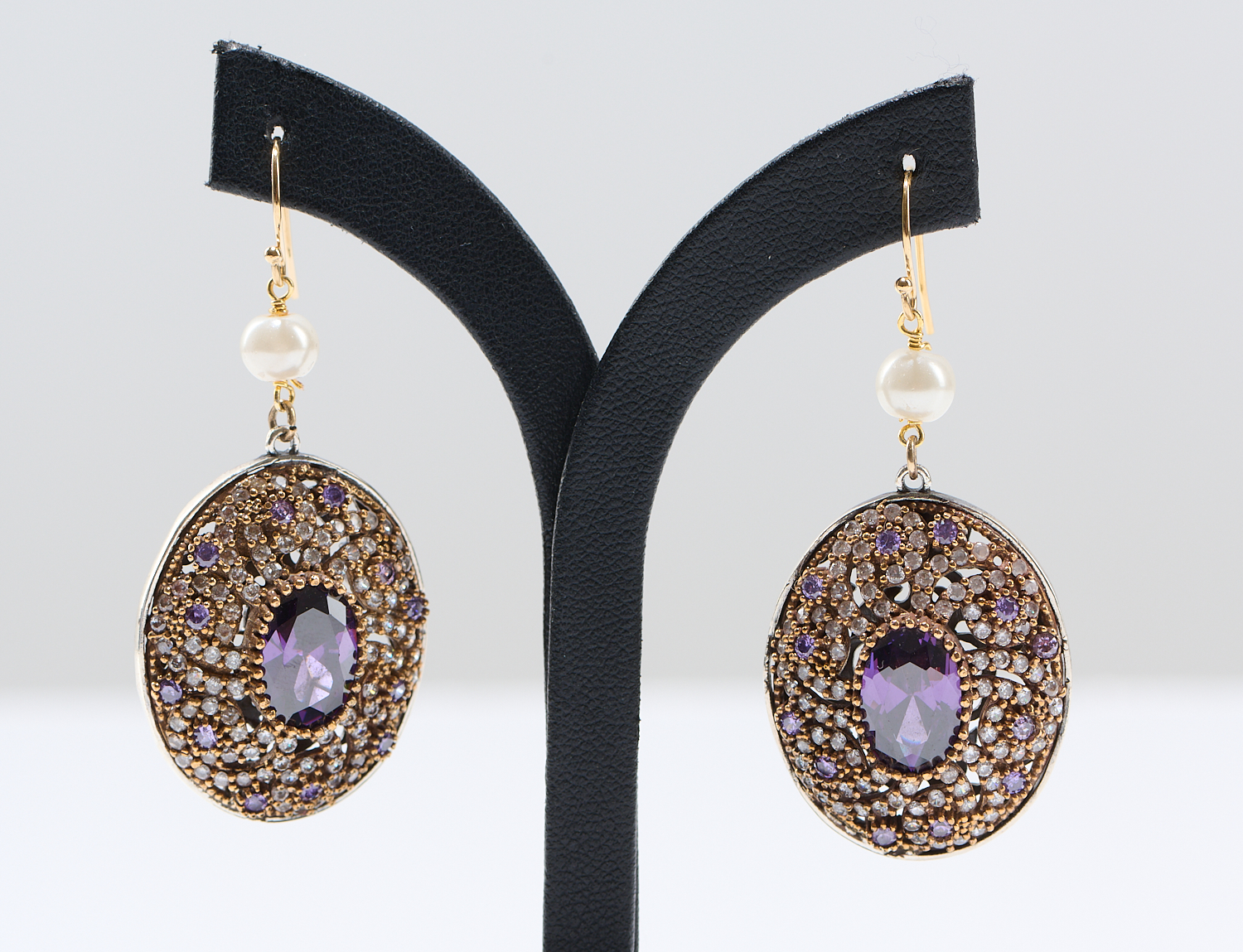 A PAIR OF AMETHYST, CUBIC ZIRCONIA AND PEARL SET EARRINGS IN SILVER GET, TO SHEPHERDS HOOK FITTINGS