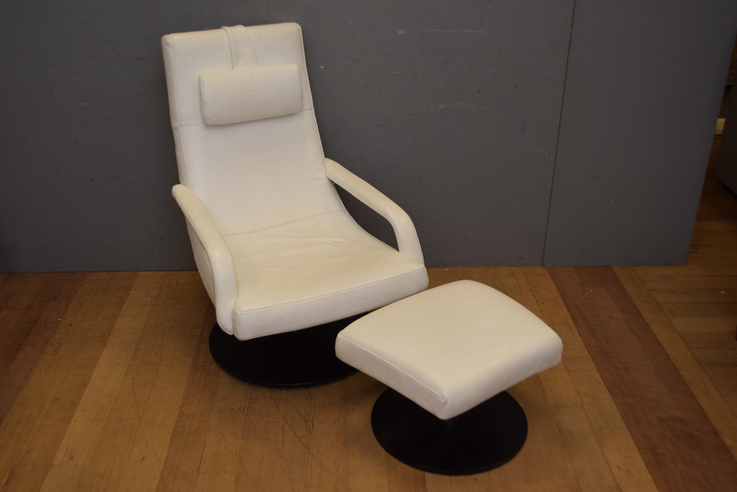 A WHITE LEATHER SWIVEL CHAIR AND OTTOMAN (A/F) (102H x 67W x 82D CM) (LEONARD JOEL DELIVERY SIZE: LARGE)