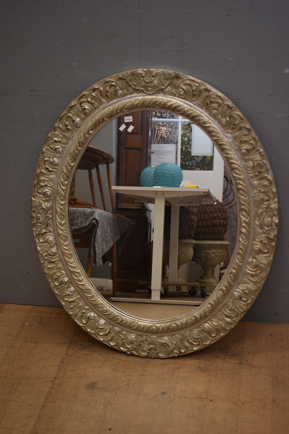 A DECORATIVE OVAL SHAPED SILVER PAINTED MIRROR (102H x 86W CM) (LEONARD JOEL DELIVERY SIZE: LARGE)