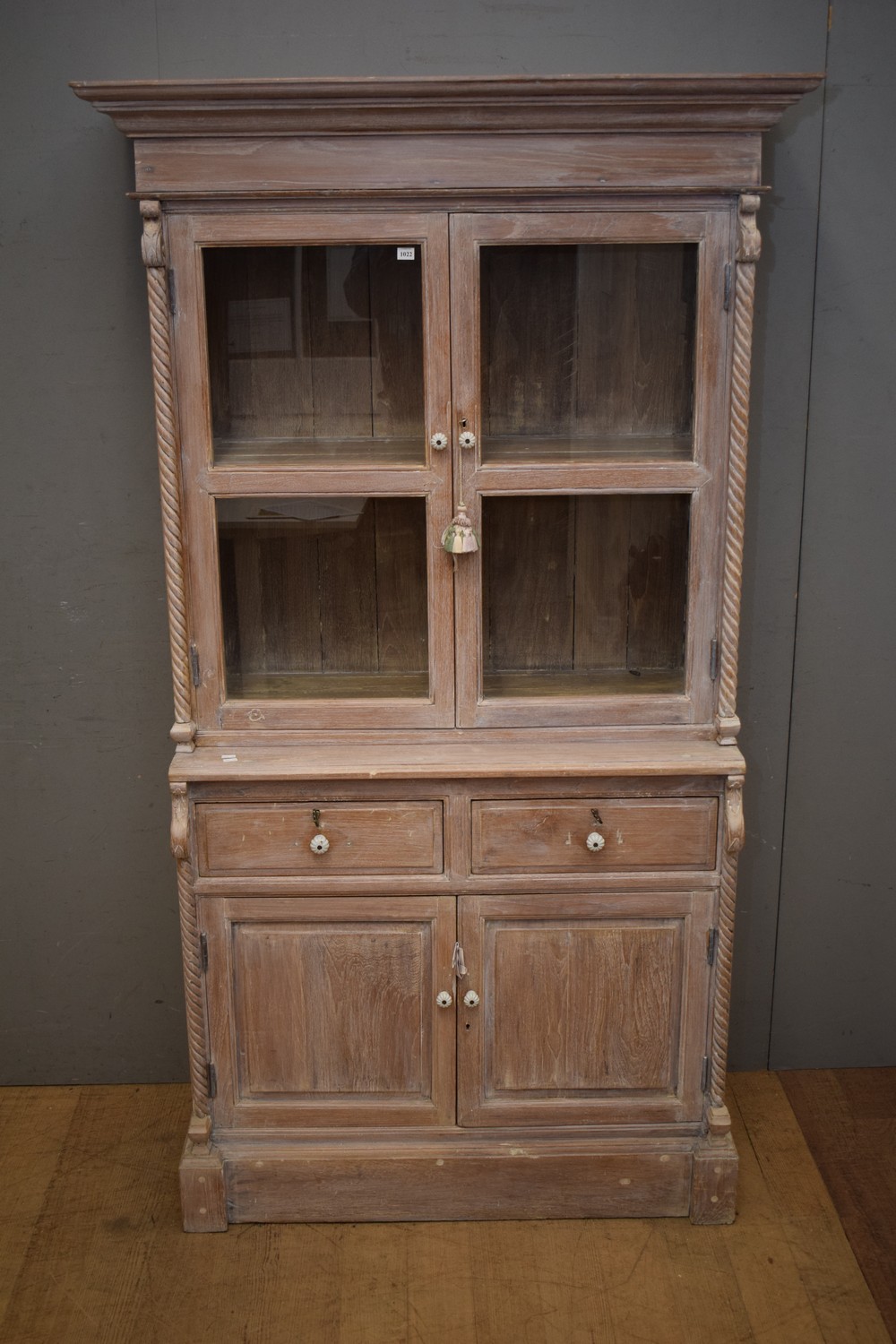 A DOUBLE BODIED TWO DOOR WOODEN GLAZED CABINET (185H x 106W x 44D CM) (PLEASE NOTE THIS HEAVY ITEM MUST BE REMOVED BY CARRIERS AT THE CUSTOMER'S EXPENSE. LEONARD JOEL STAFF CANNOT ASSIST CARRYING THIS ITEM) (X-LARGE ITEM)