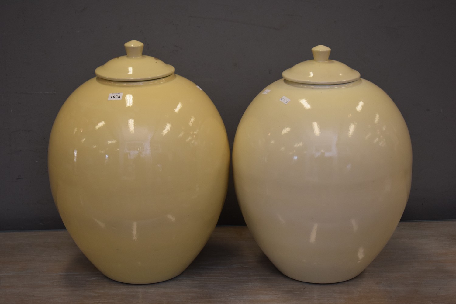 TWO YELLOW LIDDED JARS (A/F) (47H x 34D CM) (LEONARD JOEL DELIVERY SIZE: LARGE)