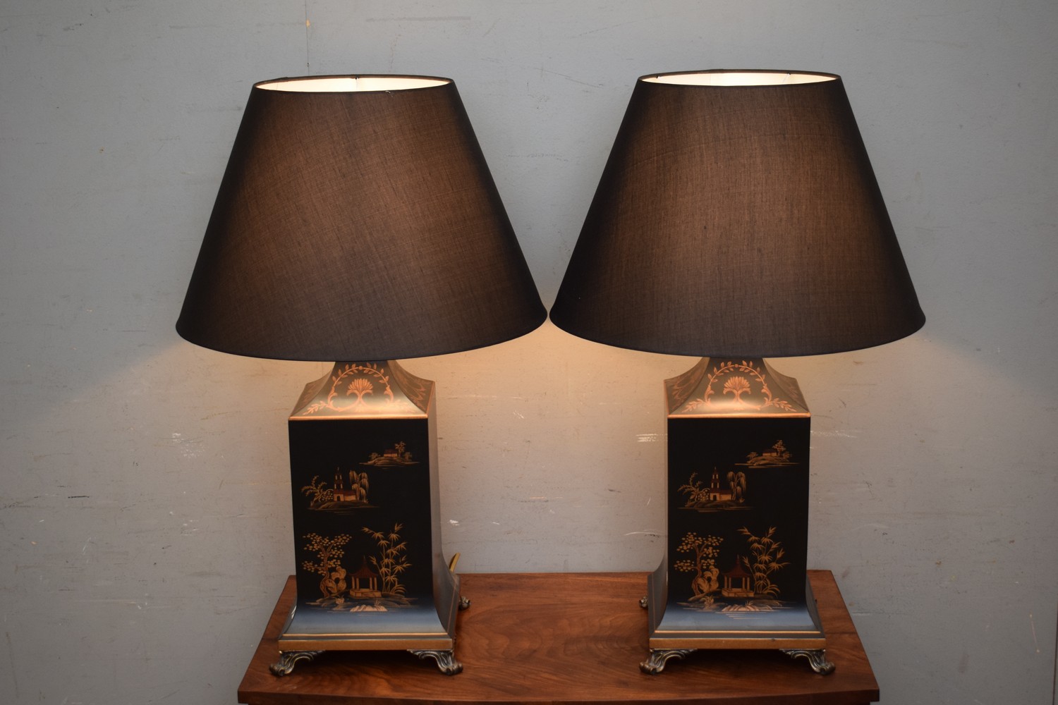 A PAIR OF CHINOISERIE STYLE TABLE LAMPS WITH HAND PAINTED DETAILING (77H CM) (LEONARD JOEL DELIVERY SIZE: LARGE)
