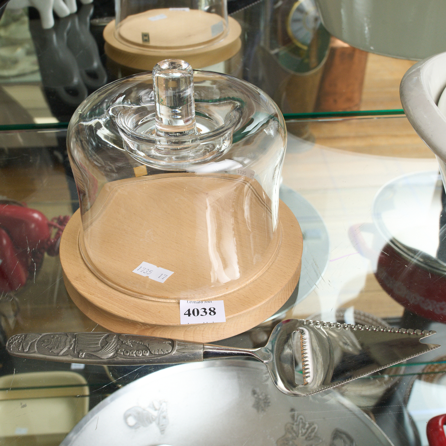 A NORWEGIAN HADELAND CHEESE DOME AND A NORWEGIAN PEWTER HANDLED KONGE TINN CHEESE KNIFE (15CM H), LEONARD JOEL LOCAL DELIVERY SIZE: SMALL