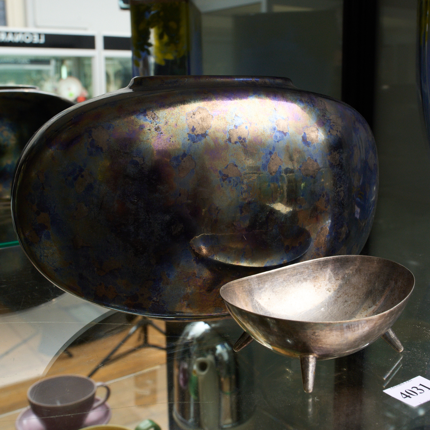 A MID CENTURY WEST GERMAN VASE WITH A LUSTRE GLAZE AND A SMALL 1950'S WMF METAL BOWL (14CM H), LEONARD JOEL LOCAL DELIVERY SIZE: SMALL