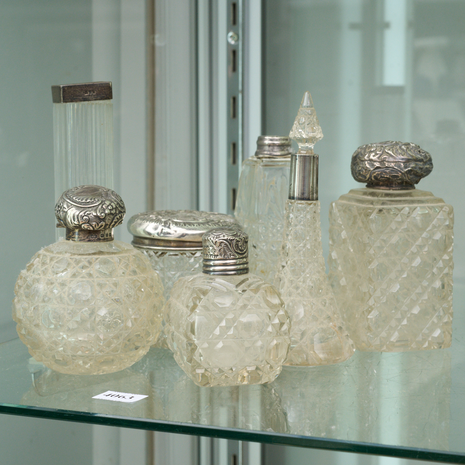 A GROUP OF SEVEN BOTTLES WITH STERLING SILVER LIDS, LEONARD JOEL LOCAL DELIVERY SIZE: SMALL