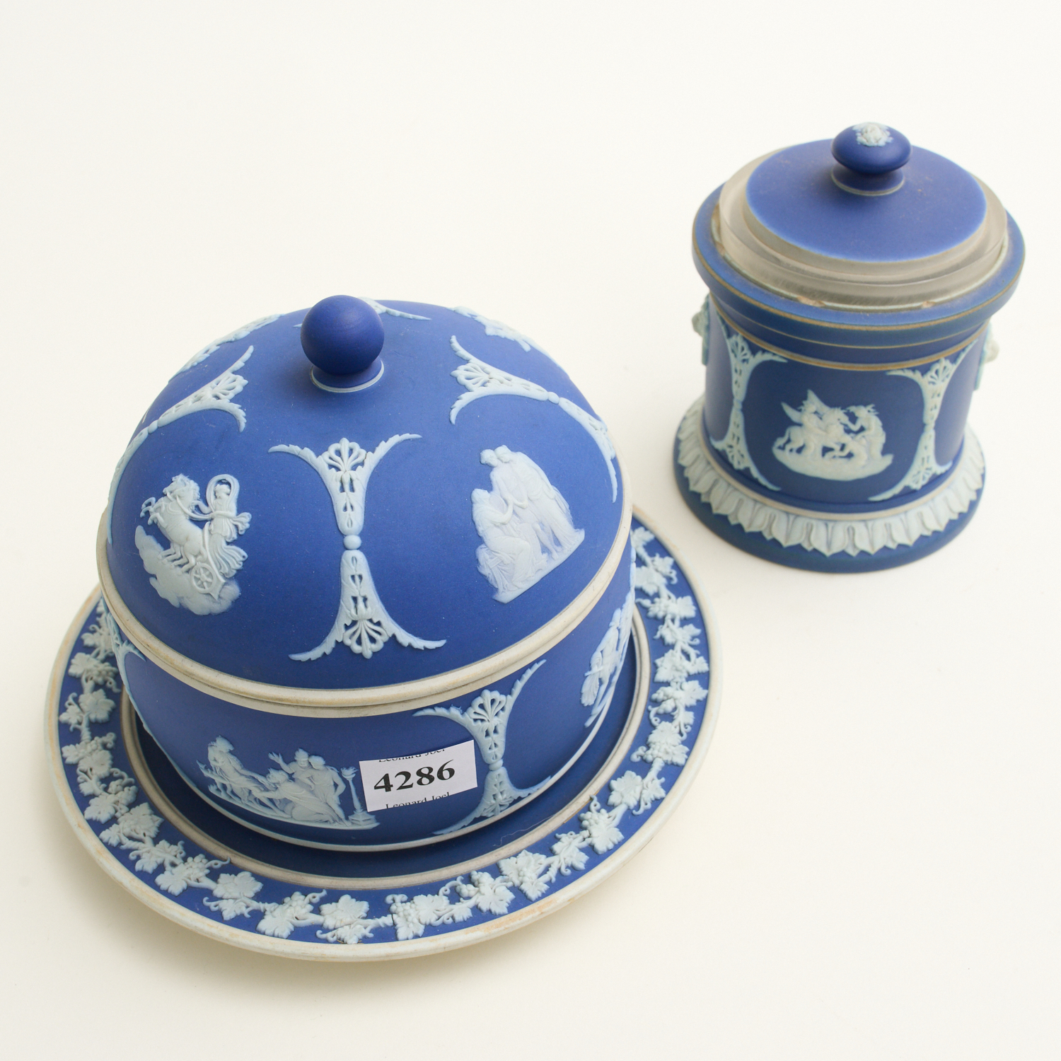 A GROUP OF WEDGWOOD JASPERWARE INCLUDING LIDDED BOWL, PLATE AND LIDDED POT, LEONARD JOEL LOCAL DELIVERY SIZE: SMALL