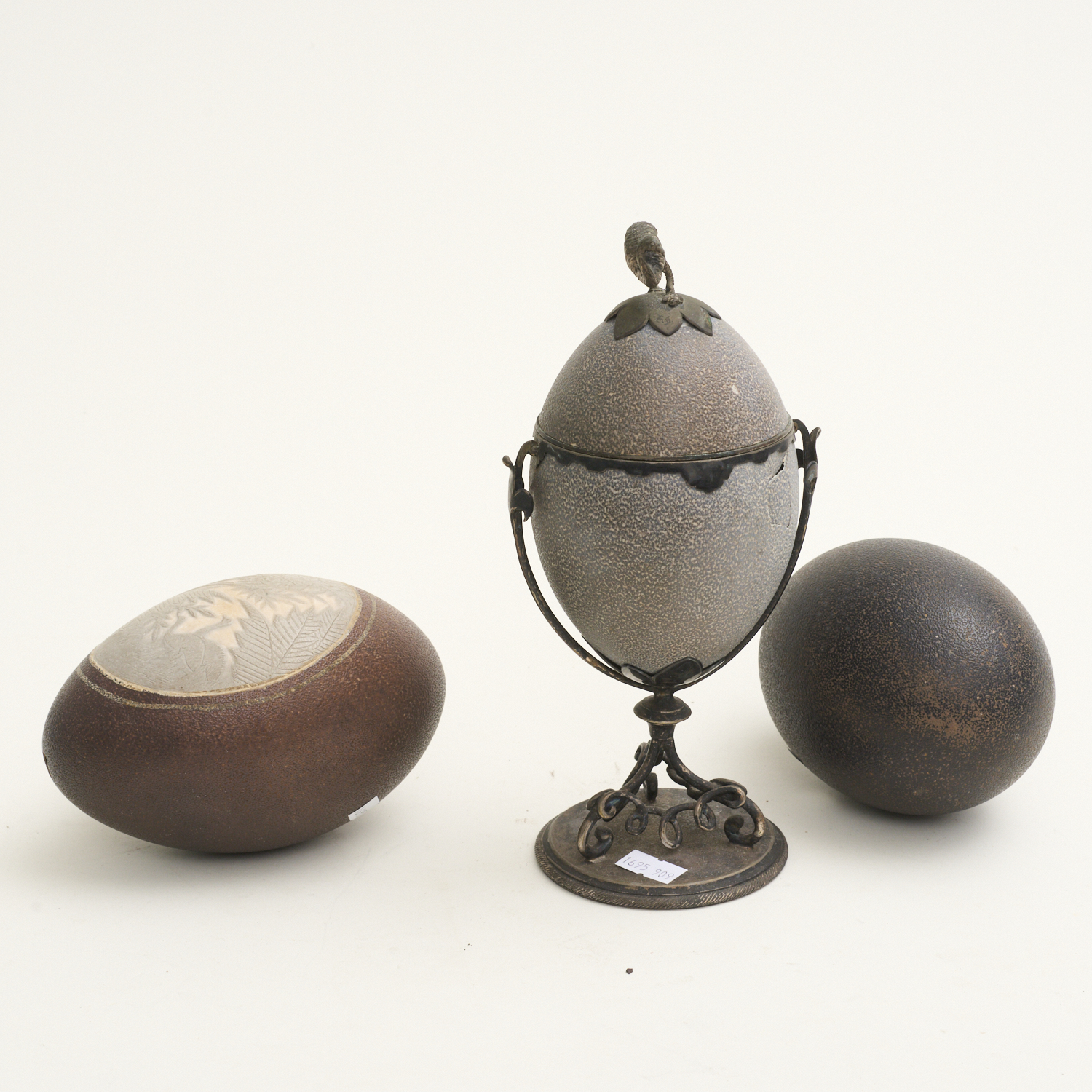 A MOUNTED EMU EGG (A/F) TOGETHER WITH TWO OTHER EGGS, LEONARD JOEL LOCAL DELIVERY SIZE: SMALL. The Rodney Permezel Collection