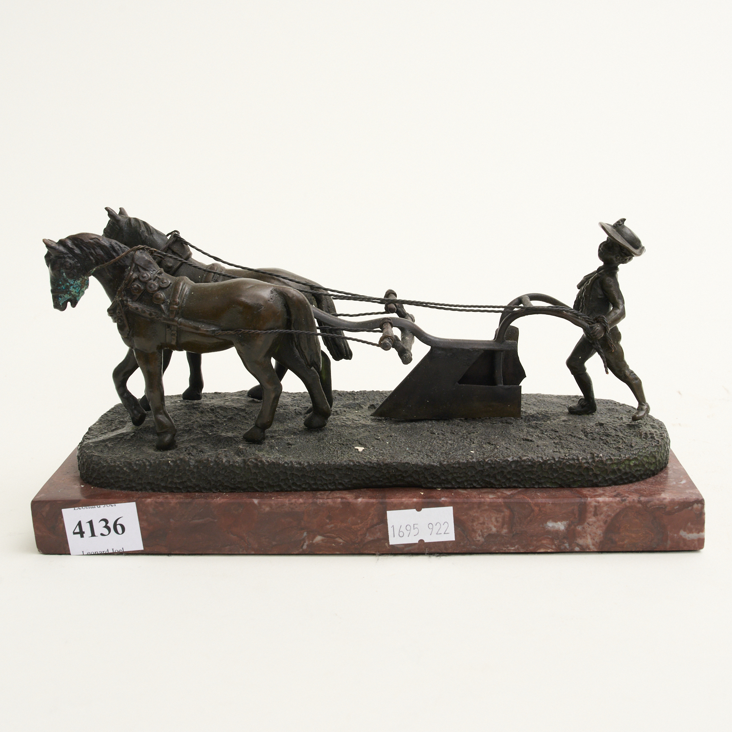 A SPELTER FIGURE GROUP OF BOY WITH PLOUGH ON MARBLE BASE L.22.5CM, LEONARD JOEL LOCAL DELIVERY SIZE: SMALL. The Rodney Permezel Collection