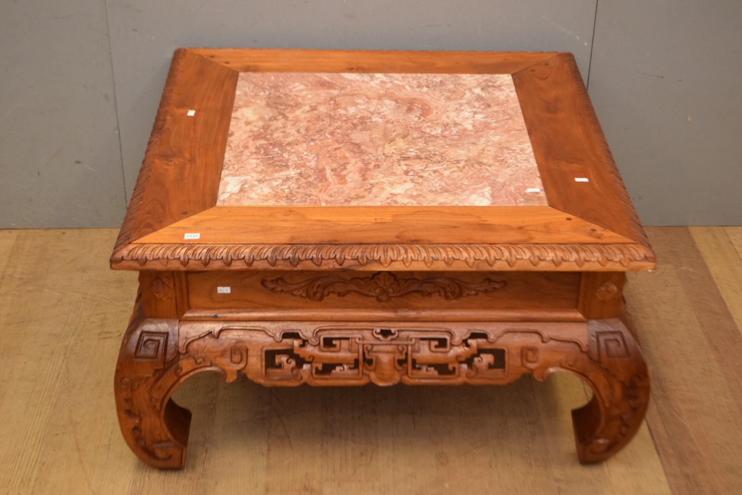 A MARBLE INSET ORIENTAL COFFEE TABLE (50H x 90W x 90D CM) (PLEASE NOTE THIS HEAVY ITEM MUST BE REMOVED BY CARRIERS AT THE CUSTOMER'S EXPENSE. LEONARD JOEL STAFF CANNOT ASSIST CARRYING THIS ITEM) (X-LARGE ITEM)
