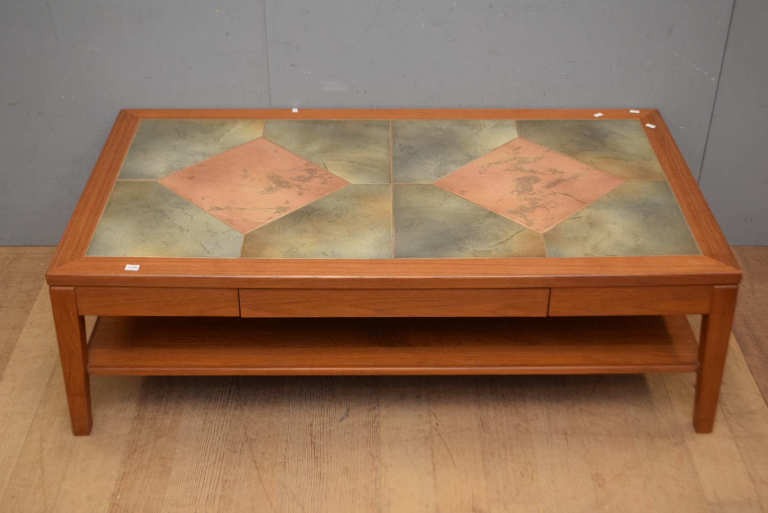 A DANISH MID CENTURY TILE TOP TEAK COFFEE TABLE BY MOBELFABRIKKEN TOFTEN (41H x 134W x 73D CM) (PLEASE NOTE THIS HEAVY ITEM MUST BE REMOVED BY CARRIERS AT THE CUSTOMER'S EXPENSE. LEONARD JOEL STAFF CANNOT ASSIST CARRYING THIS ITEM) (X-LARGE ITEM)