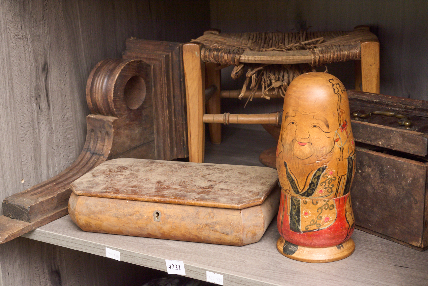 A SHELF OF WOODENWARE (A/F), LEONARD JOEL LOCAL DELIVERY SIZE: SMALL. The Rodney Permezel Collection