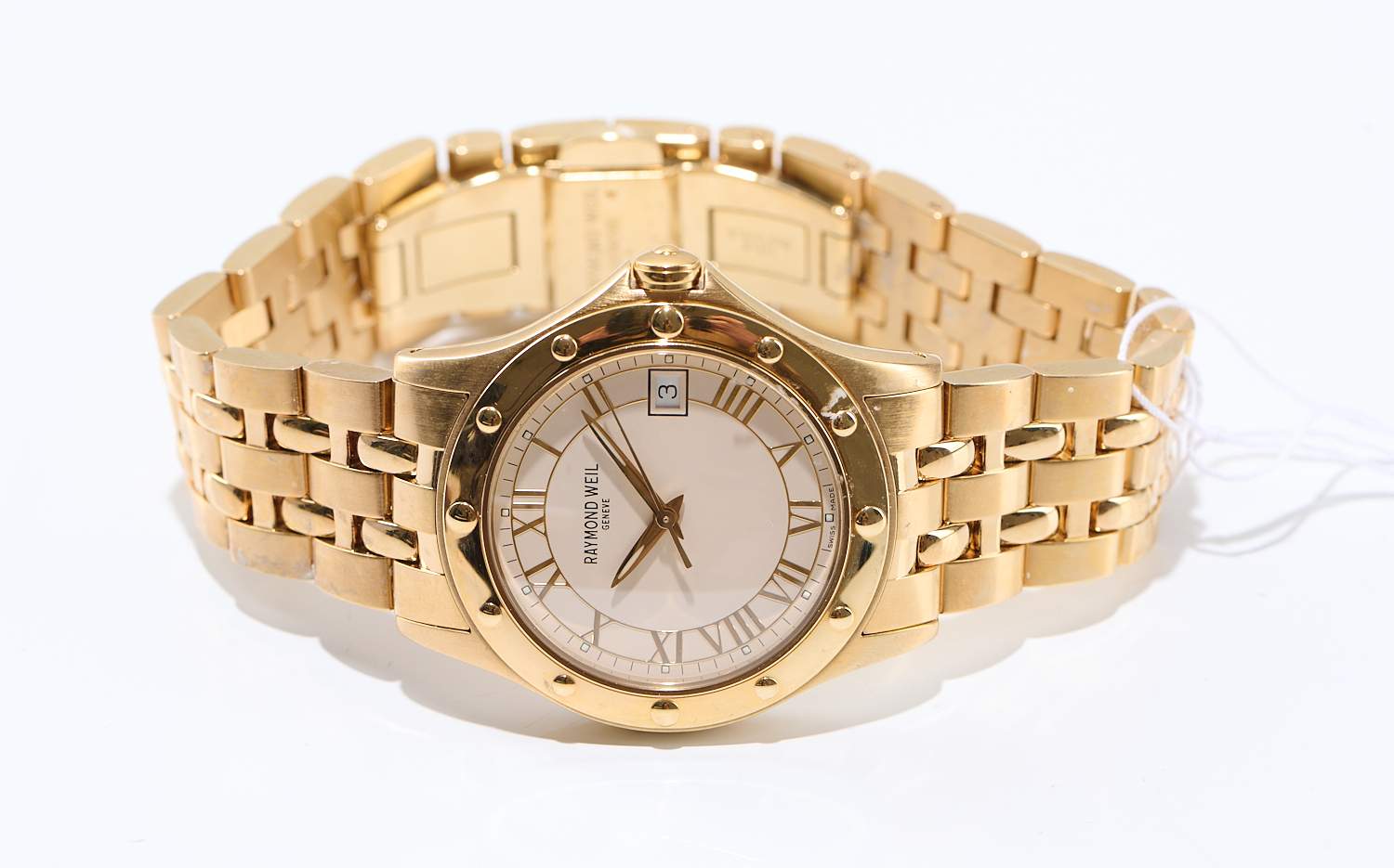 A WRIST WATCH IN GOLD BY RAYMOND WEIL