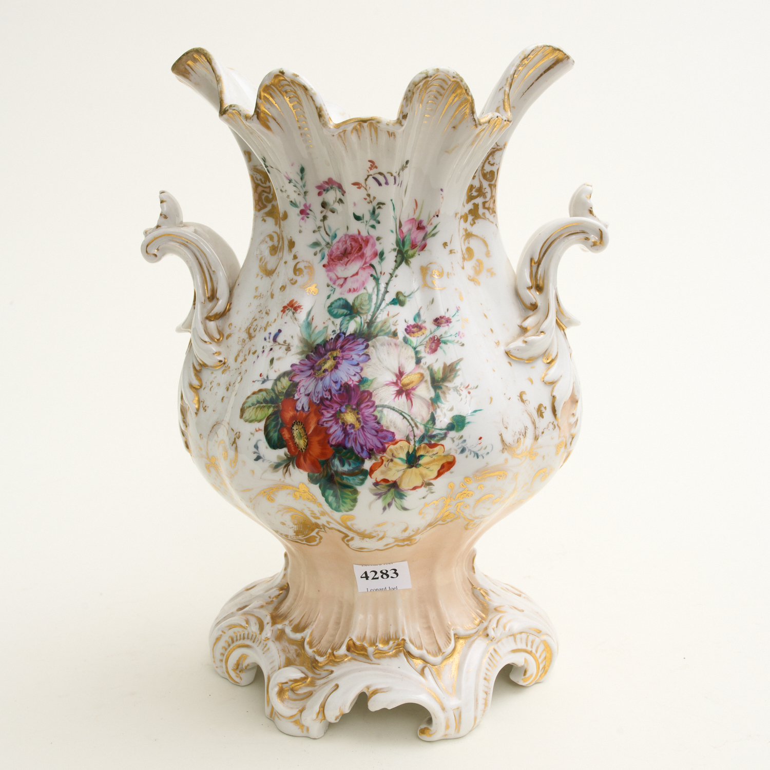 A PORCELAIN VASE WITH HANDPAINTED FLORAL DECORATION (A/F), LEONARD JOEL LOCAL DELIVERY SIZE: SMALL. The Rodney Permezel Collection