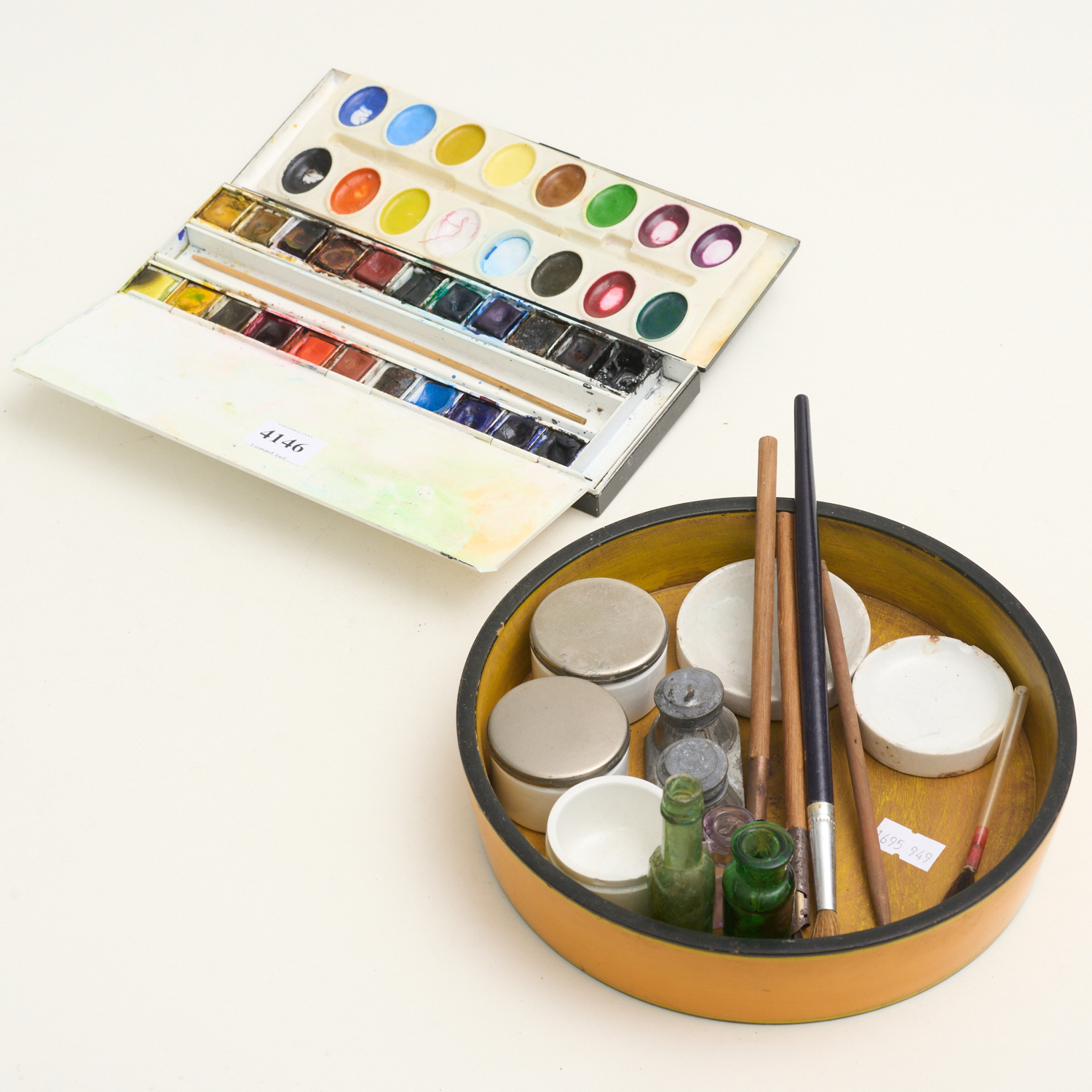 A SET OF WATERCOLOUR PAINTS TOGETHER WITH INKWELLS AND OTHER, LEONARD JOEL LOCAL DELIVERY SIZE: SMALL. The Rodney Permezel Collection