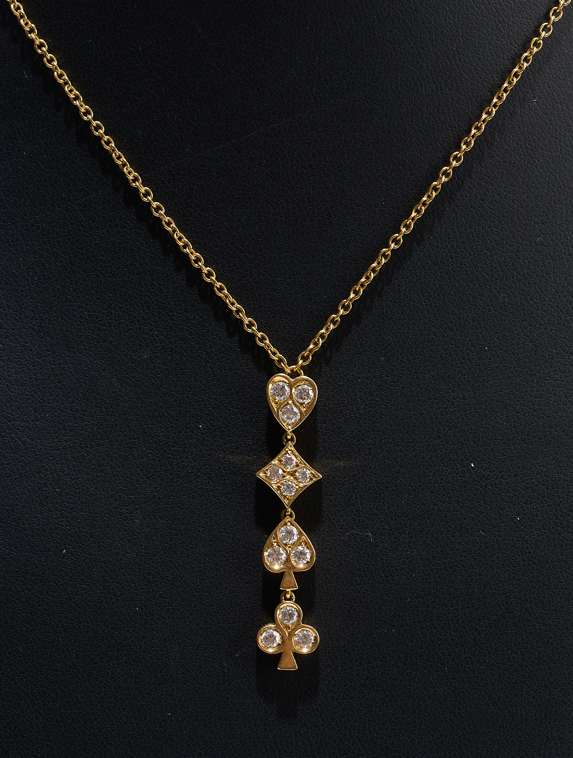 A DIAMOND PENDANT NECKLACE WITH DIAMOND-SET HEART, SPADE, DIAMOND AND CLUB MOTIF IN 18CT GOLD, TOGETHER WEIGHING APPOXIMATELY 0.85CTS