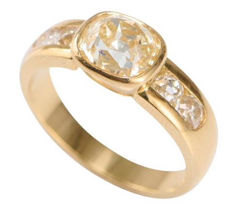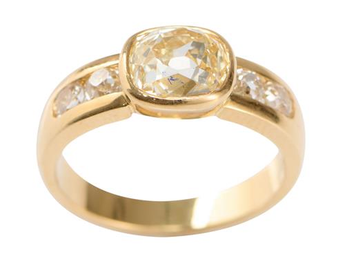 Centring an old cushion-cut yellow diamond weighing approximately 1.80 carats, flanked by cushion-cut diamonds together weighing approximately 0.68 carats, ring size N.