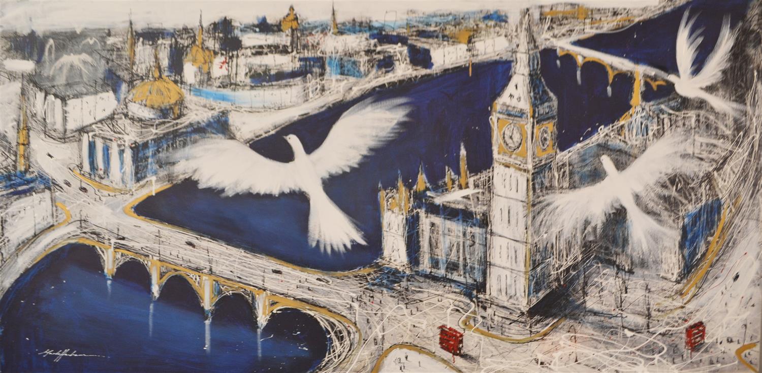 MARK HANHAM, LONDON PEACE AND LOVE, MIXED MEDIA ON CANVAS, 99 X 200CM