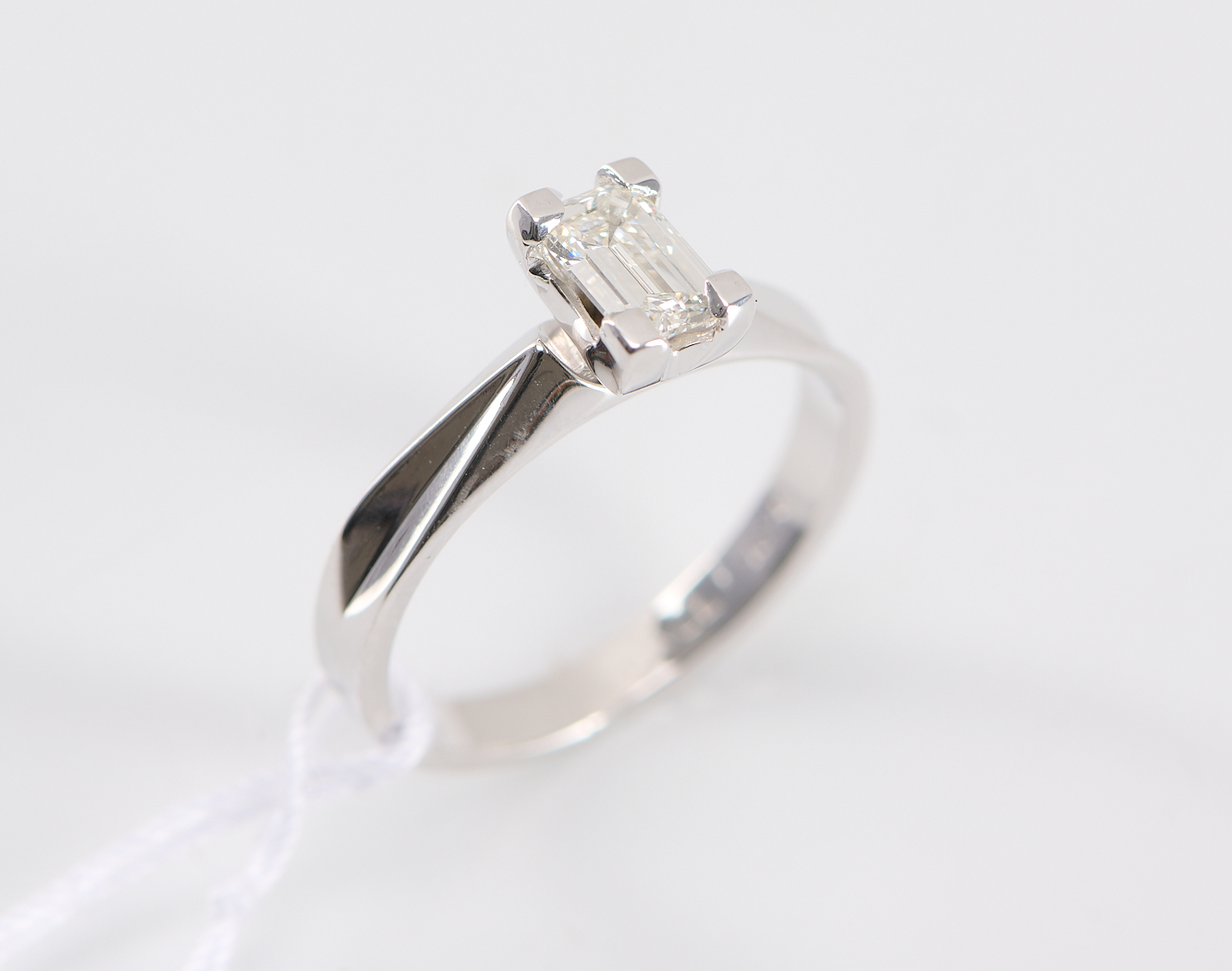 AN EMERALD CUT DIAMOND RING IN 18CT WHITE GOLD, THE DIAMOND TOTALLING APPOXIMATELY 0.50CTS, RING SIZE K/L, 3.2GMS