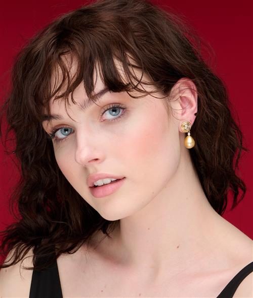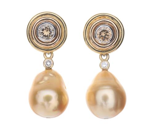 Each earring suspending a detachable baroque pearl of golden hues measuring 13.20 by 11.90mm, suspended below a collet-set cognac diamond surmount weighing approximately 0.30 carats, to post and butterfly fittings, length 28mm.