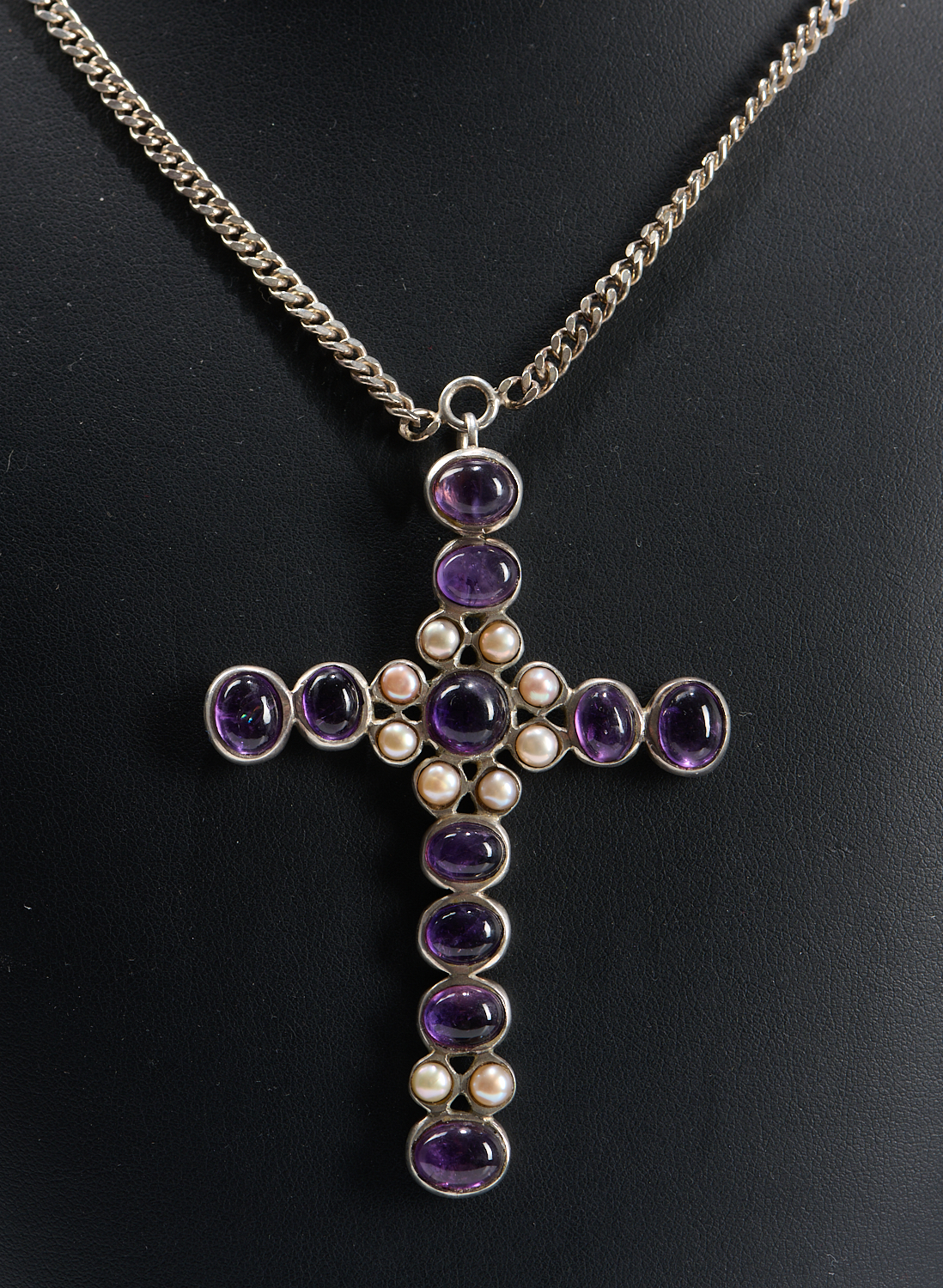 AN AMETHYST AND PEARL SET CROSS IN SILVER, TO A CONFORMING TRACE CHAIN, THE CROSS MEASURING 77 X 55MM