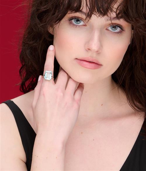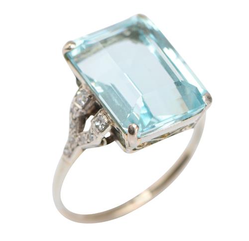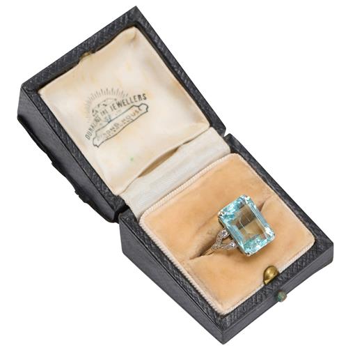Centring an emerald-cut aquamarine weighing approximately 10.20 carats, to geometric shoulders detailed with old-European cut diamonds, ring size R.