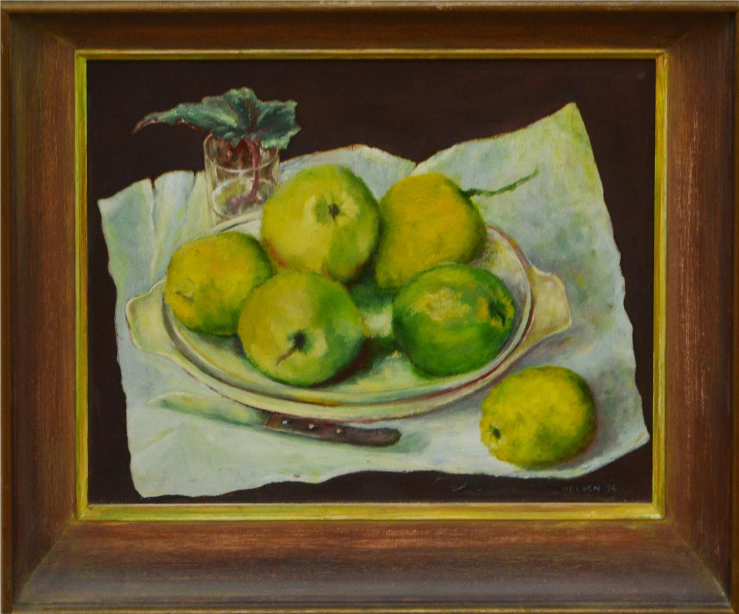 SIGNED C. HELSEN, STILL LIFE WITH APPLES 1974, OIL ON PANEL, 30 X 37CM