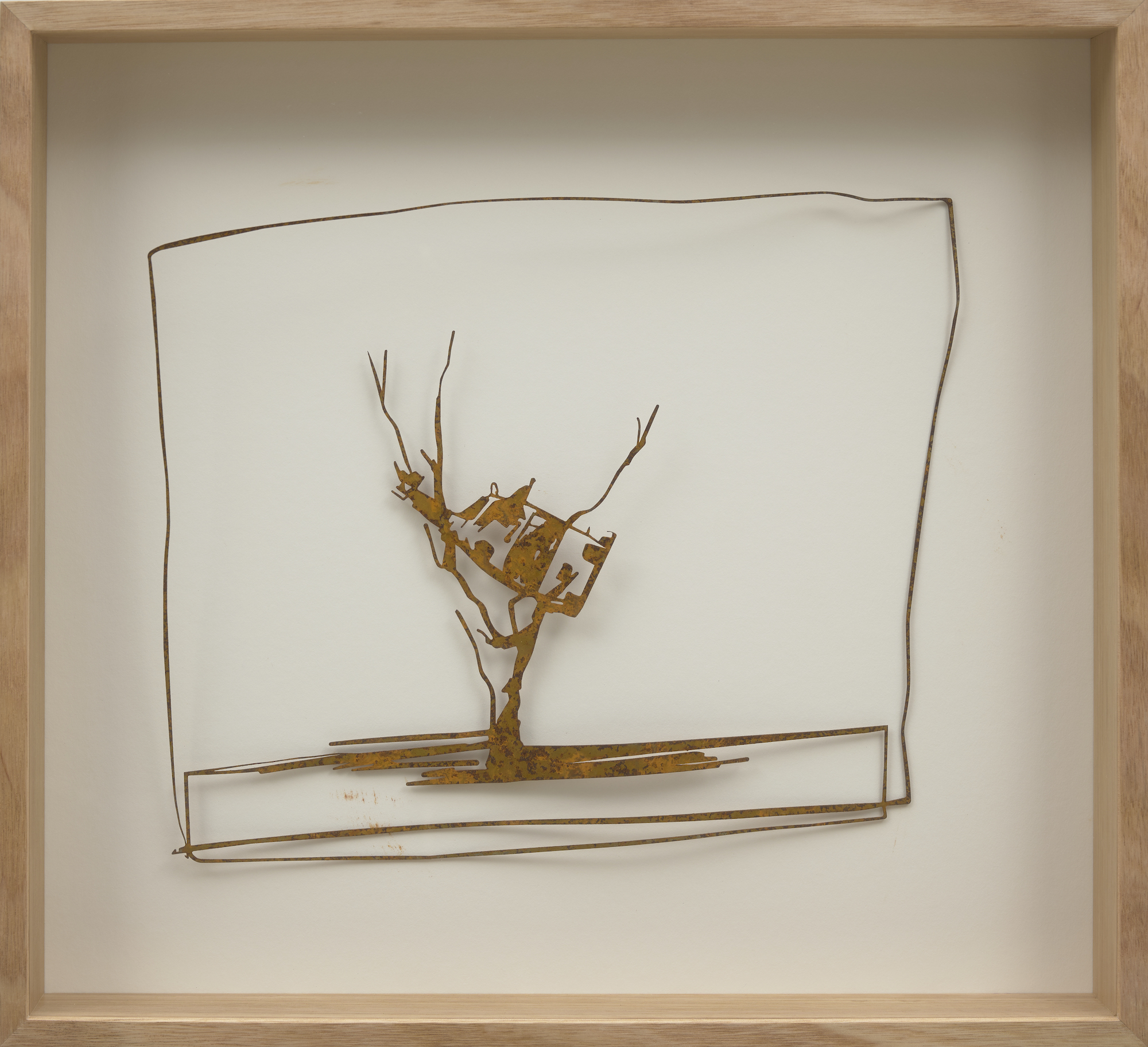 Work bares evidence of corrosion, however this is inherent to the medium. The corrosion has transferred to the backing in an area of contact located on the lower left quadrant. Work appears loose and could benefit to the back bolt (tightening). Overall frame size 43 x 47cm.